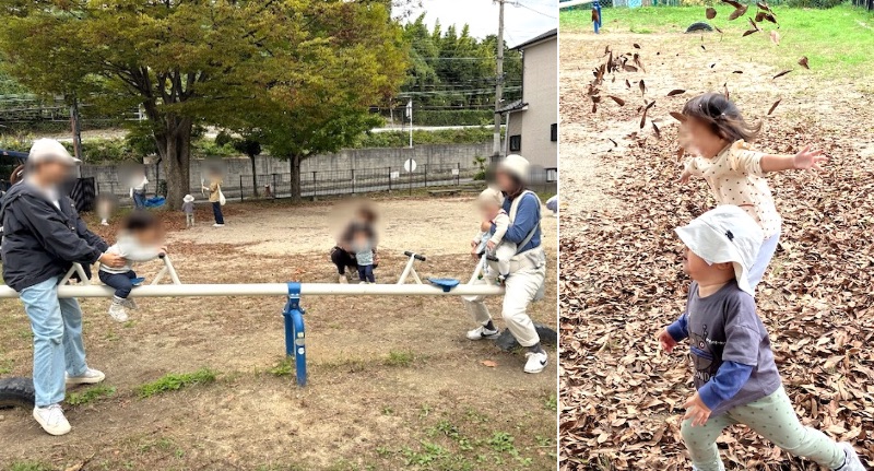 よちよち歩きながらシャボン玉を追いかける姿やシーソーあそびが好きになったり、親子でブランコを楽しんだり電車に手を振ったり、落ち葉あそびなど、初めての体験がたくさんあったようです。みんなで公園あそびは、「楽しいなぁ」と呟きながら帰りました。