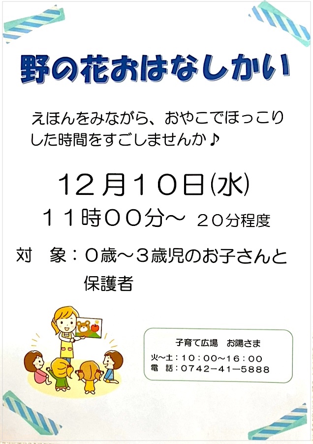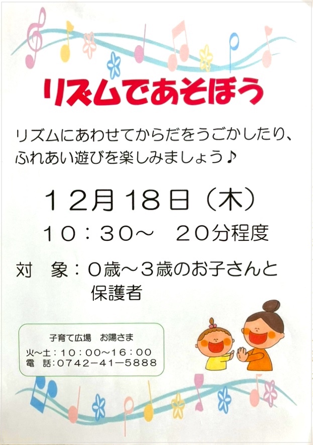 2025 年 11 月 26 日公開 お陽さま12月の講座 #お陽さま *お陽さま12月の講座* ⚪︎野の花おはなしかい 10日(水) 11:00〜 20分程度 ⚪︎リズムで遊ぼう 18日(木) 10:30〜 20分程度 ※詳細はチラシをご覧ください。 お陽さま年末年始は、12/28(日)~1/5(月)までお休みです。
