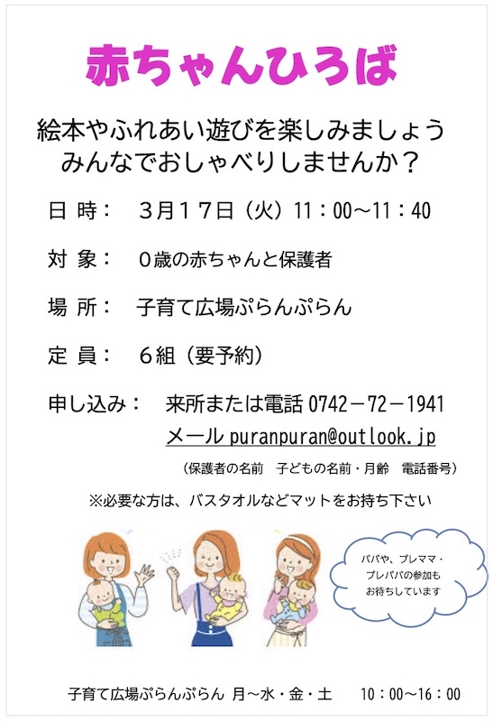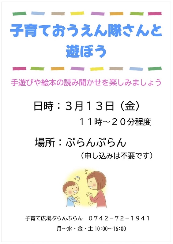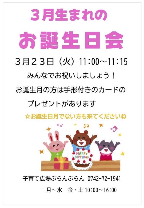2026 年 3 月 3 日公開 ぷらんぷらん3月の講座 #ぷらんぷらん 《3月の講座予定》 13日(金)11:00~20分程度「子育ておうえん隊さんと遊ぼう」 17日(火)11:00~11:40「赤ちゃんひろば」 23日(月)11:00~11:15 「3月生まれのお誕生日会」 お誕生日カードのプレゼントを用意しています。 講座の詳細はチラシをご覧ください。
