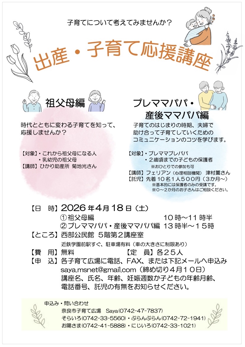 2026 年 3 月 12 日公開 「出産・子育て応援講座」 #saya #お陽さま #にじいろ #ぷらんぷらん #そらいろ #お知らせ 「出産・子育て応援講座」 【日時】2026年4月18日(土) ①祖父母編:10時~11時半 時代とともに変わる子育てを知って応援しませんか? ②プレママパパ・産後ママパパ編:13時半から15時 子育てのはじまりの時期、夫婦で助け合って子育てしていくためのコミュニケーションのコツを学びます 【ところ】西部公民館 5階第2講座室 近鉄学園前すぐ 駐車場有料 ※詳細、申し込みは、チラシをご覧ください 各広場に電話、FAX、またはメール sorairo.msnet@gmail.com