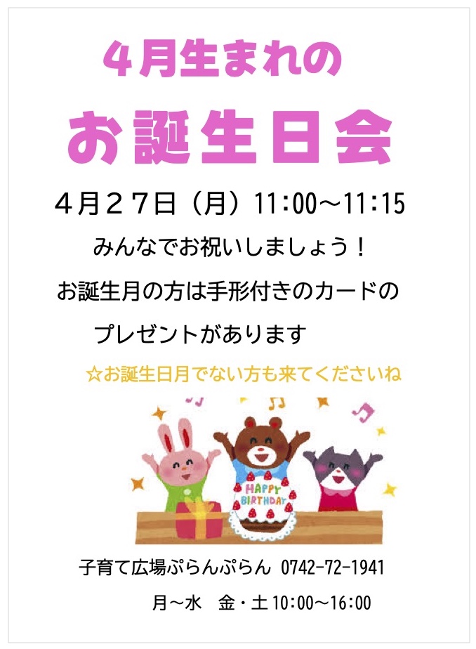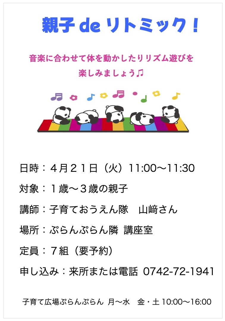 2026 年 4 月 1 日公開 ぷらんぷらん4月の講座 #ぷらんぷらん 《4月の講座予定》 18日(土) 「出産・子育て応援講座」→チラシ ①祖父母編 10:00~11:30 ②プレママプレパパ・産後ママパパ編 13:30~15:00 21日(火)11:00~11:30「親子deリトミック」 27日(月)11:00~11:15 4月生まれのお誕生日会」 お誕生日カードのプレゼントを用意しています。 講座の詳細はチラシをご覧ください。