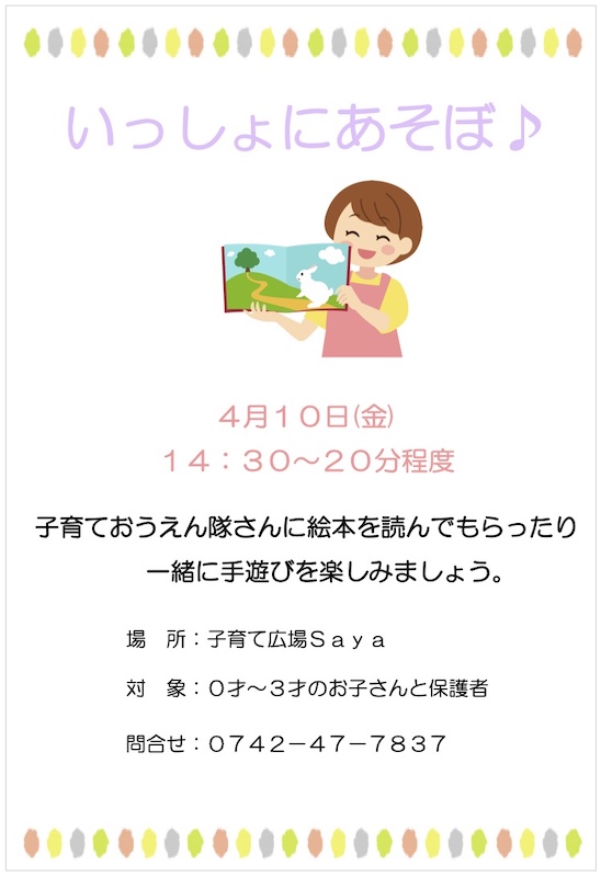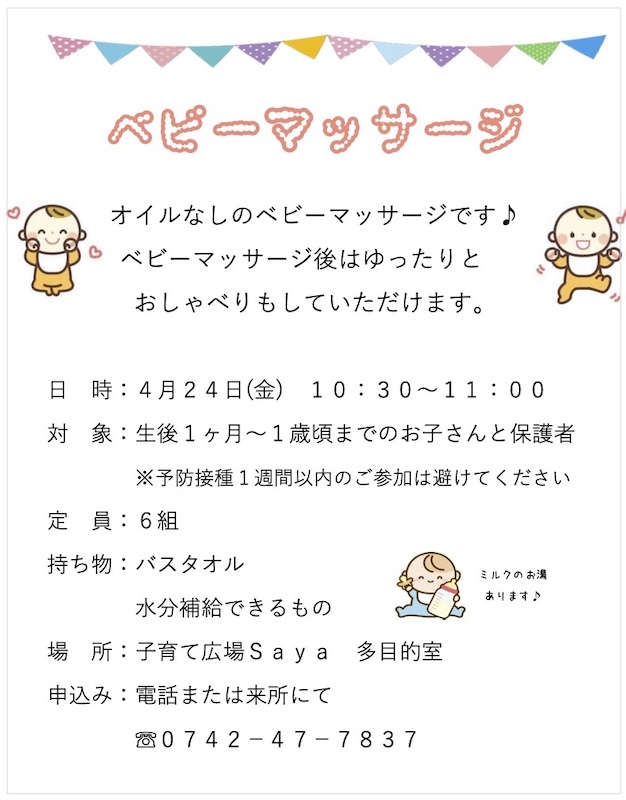 2026 年 4 月 5 日公開 Saya4月の講座 #saya Saya4月の講座 〇いっしょにあそぼ♪ 10日(金) 14:30~20分程度 〇ベビーマッサージ 24日(金) 10:30~11:00 詳細はチラシをご覧ください。 *サークル相談* 4月9日(木) 10:30~11:30 「どんなサークルがあるの?」という相談をしたり、実際に子育てサークルを運営している人は運営相談ができます。